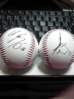 探して探して買ったグッズですー。ほんとはワクのユニフォが欲しかったんですが、やっぱ売ってなくて(泣)サインボール。ワクとなかじーセットで購入(笑)今思えば優勝記念のも買ってくれば良かった、と。